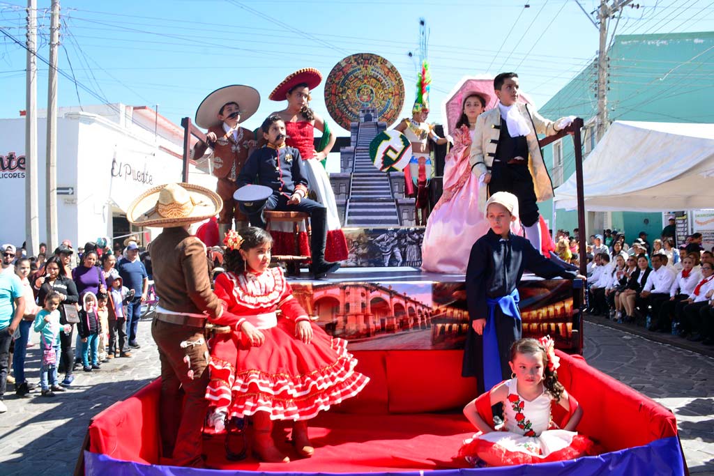 La creatividad de las instituciones educativas participantes en el desfile conmemorativo por el 107 aniversario de la Revolución Mexicana se puso de manifiesto al hacer alusión a esta parte de la historia de México, con bailes, carros alegóricos, bandas de guerra y escenificaciones propias al movimiento armado que inició el 20 de noviembre de 1910.