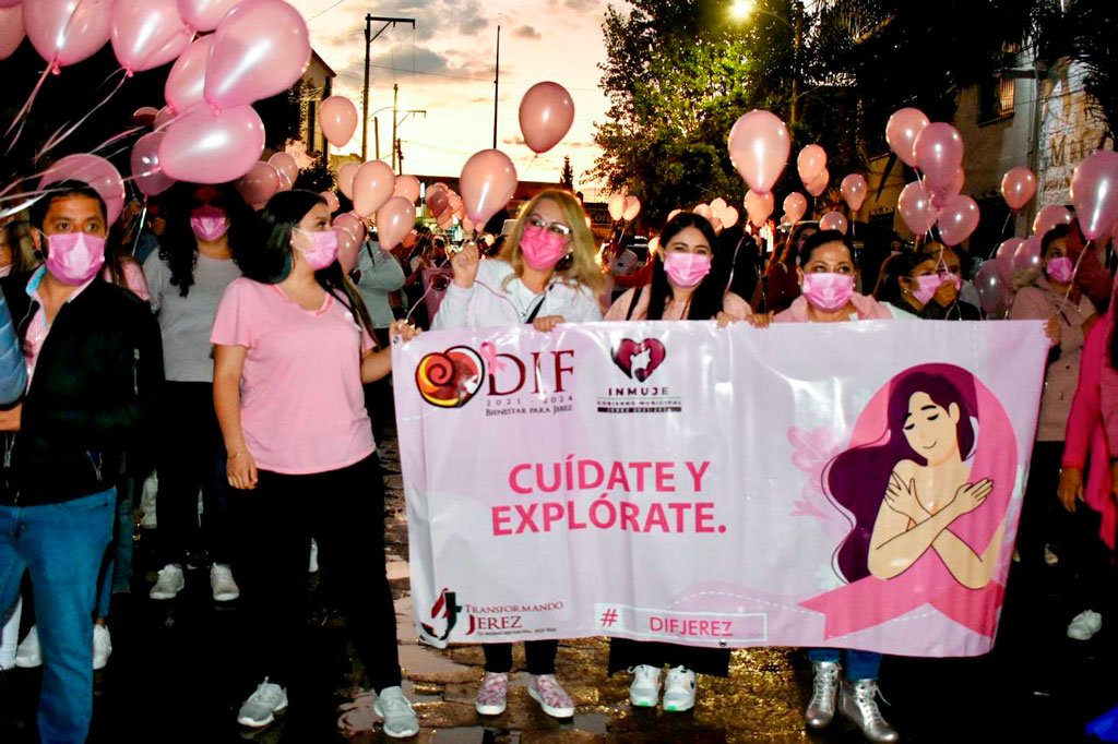 En conmemoración del Día Mundial de Lucha Contra el Cáncer de Mama, el H. Ayuntamiento de Jerez, presidido por el doctor Humberto Salazar Contreras, convocó a una marcha para la concientización sobre esta enfermedad. Dicho evento, coordinado por Sistema Municipal DIF de Jerez, concluyó con la iluminación conmemorativa del edificio de la presidencia municipal.