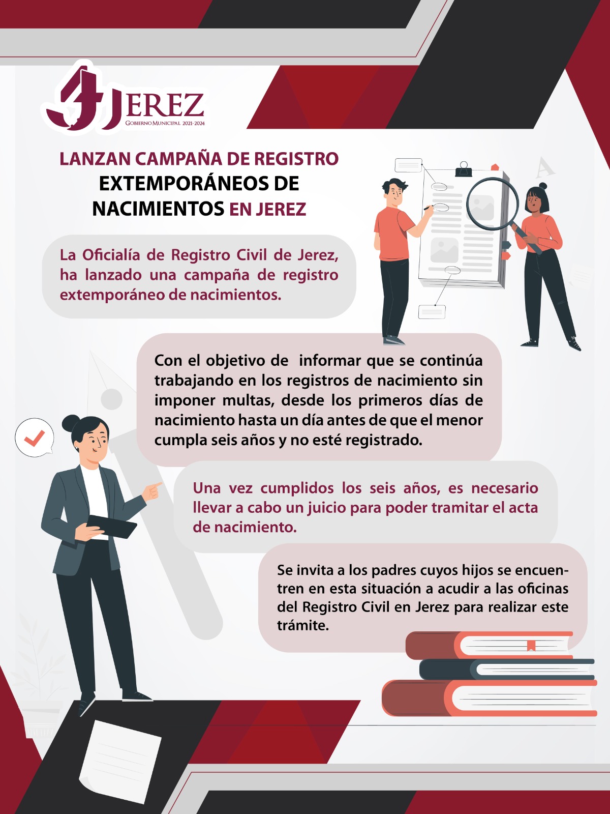 Jerez, Zac.-La Oficialía de Registro Civil de Jerez, que forma parte de la administración municipal 2021-2024, ha lanzado una campaña de registro extemporáneo de nacimientos como parte de sus actividades continuas. Esta campaña tiene como objetivo informar que se continúa trabajando en los registros de nacimiento sin imponer multas, desde los primeros días de nacimiento hasta un día antes de que el menor cumpla seis años y no esté registrado.