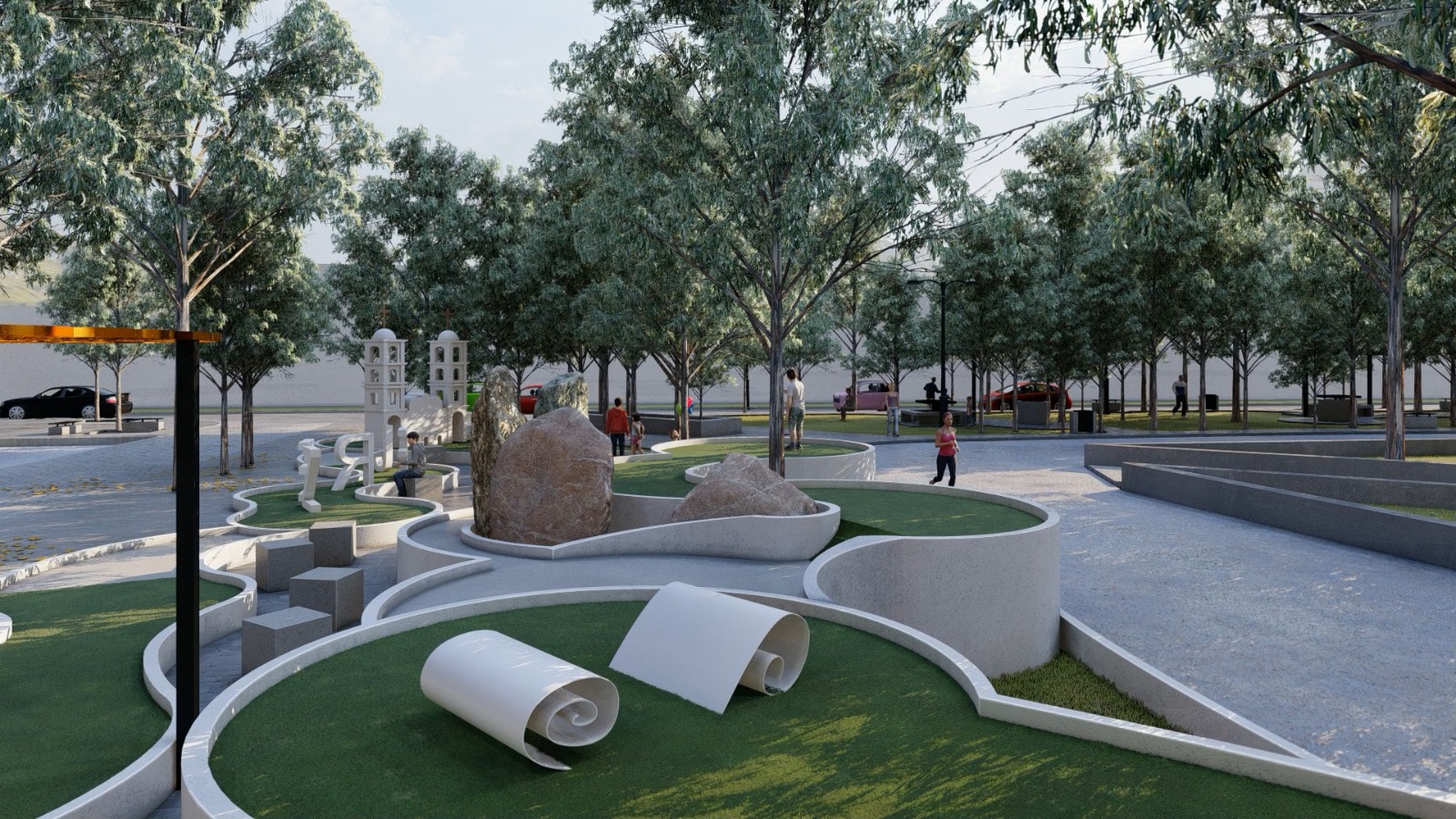 El diseño del mini golf contará con formas orgánicas y el área de juego será de pasto sintético. También se instalarán áreas de descanso con cubos de concreto para que los jugadores puedan sentarse mientras esperan su turno. Este espacio al aire libre contará con iluminación escénica y tendrá un área de 518 m2, para que personas de todas las edades puedan disfrutar de este lugar de entretenimiento familiar.