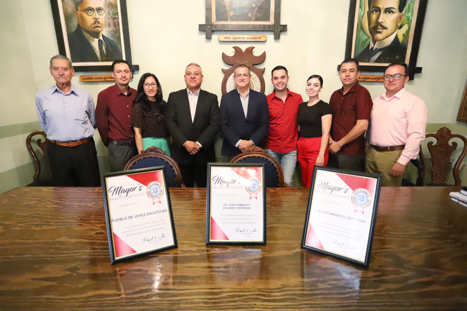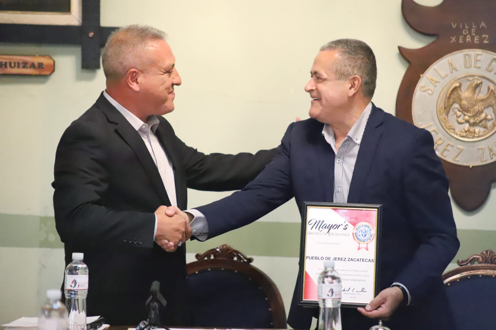 El vicealcalde de Aurora, Illinois, Guillermo Trujillo, otorgó un reconocimiento al alcalde José Humberto Salazar Contreras, al Ayuntamiento 2021-2024 y al municipio de Jerez, como muestra de la relación establecida entre las autoridades de ambos lugares, que busca consolidarse con un hermanamiento formal entre las ciudades.