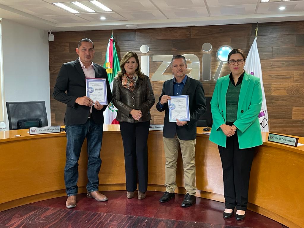 El Director del Órgano Operador Marco Antonio Valenzuela Esquivel, recibió de manos de la Comisionada Presidenta del IZAI Fabiola Torres Rodríguez, el reconocimiento que da fe a las buenas prácticas de trasparencia que se realizan en el SIMAPAJ.