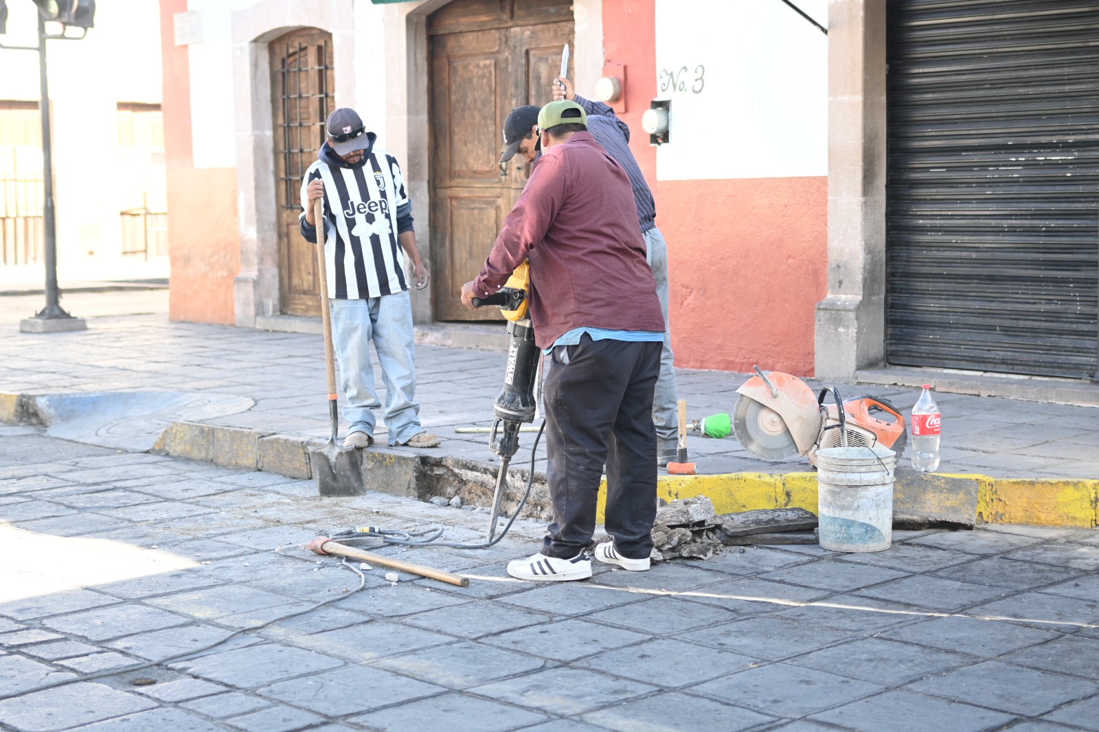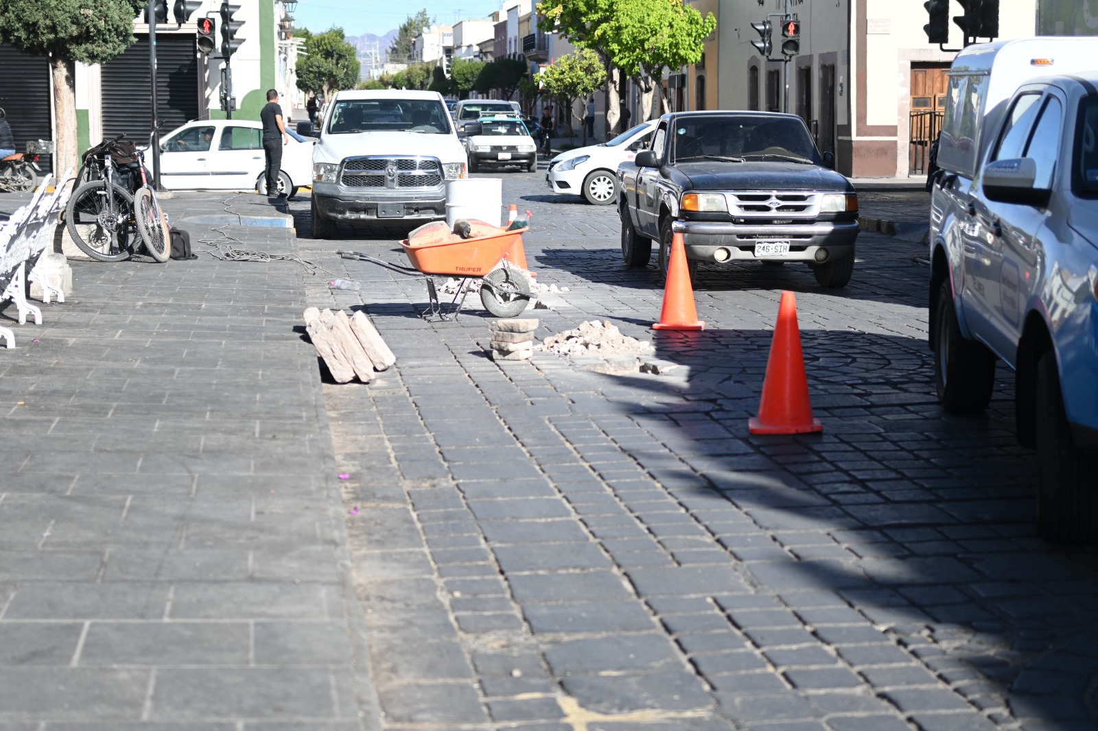 Personal de la Dirección de Obras y Servicios Públicos Municipales, atiende distintas calles del primer cuadro de la ciudad con el objetivo de mantenerlas en buenas condiciones las vialidades con miras a los festejos de la Feria de Primavera de Jerez.