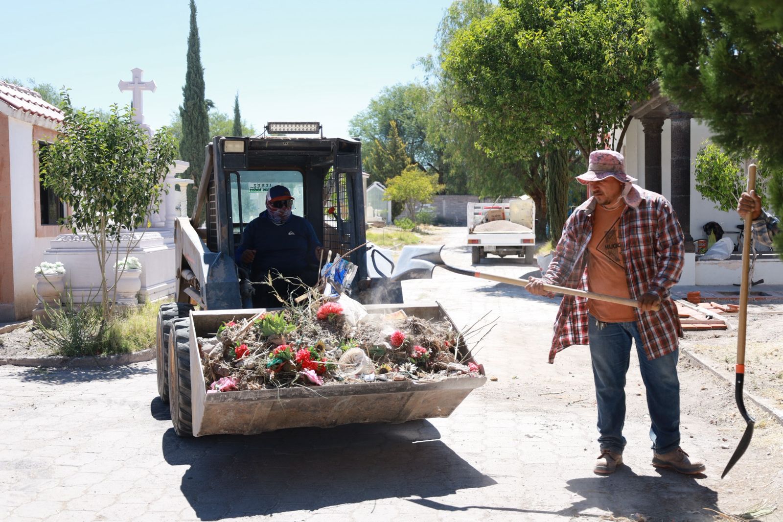 A través de la Subdirección de Servicios Públicos, cuadrillas de los Departamentos de Parques y Jardines, así como de Panteones, realizaron trabajos de mantenimiento que incluyeron la remoción de escombros, flores secas, coronas, maleza, vasos de veladoras y otros residuos acumulados en los andadores de los camposantos.