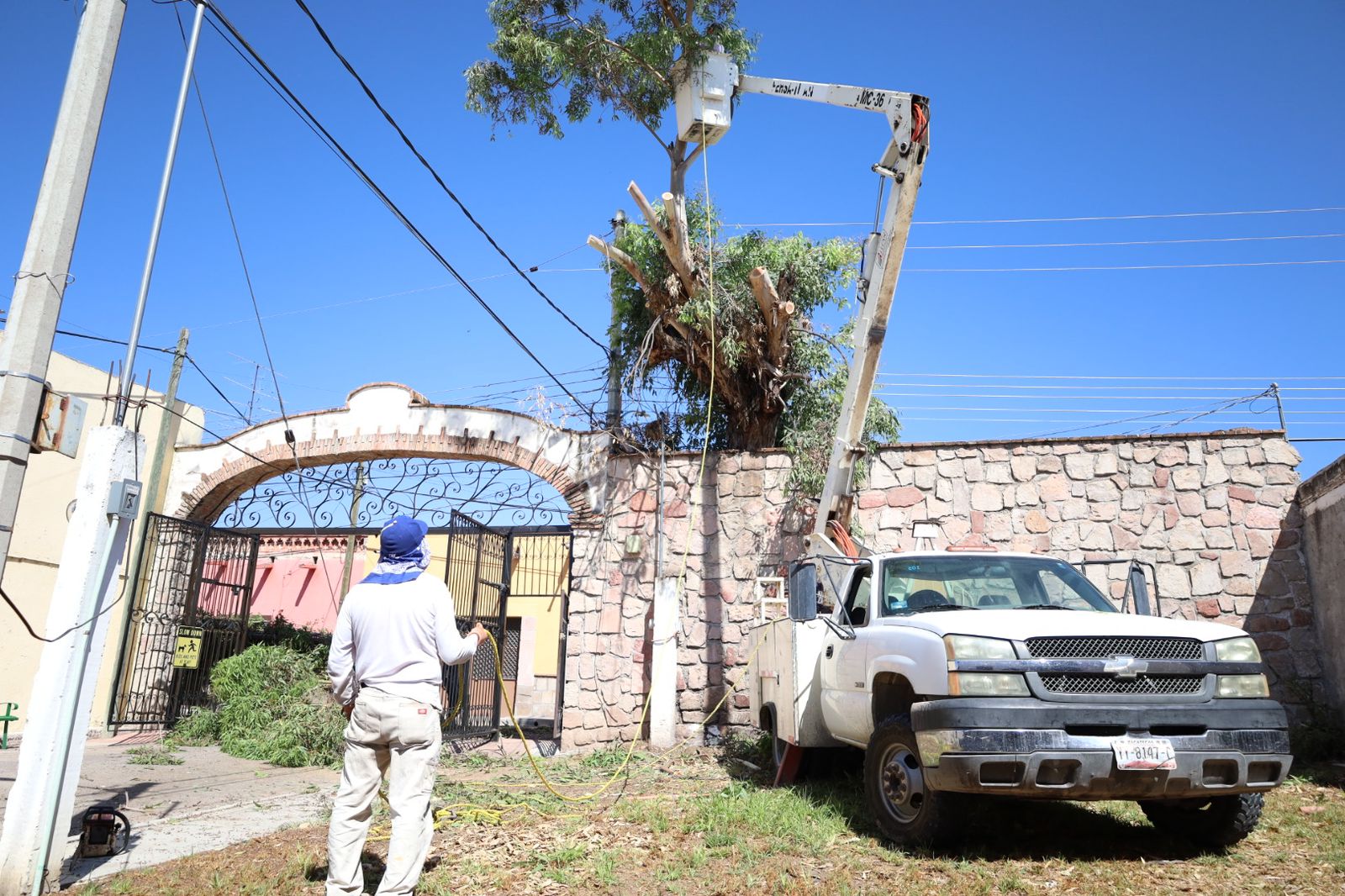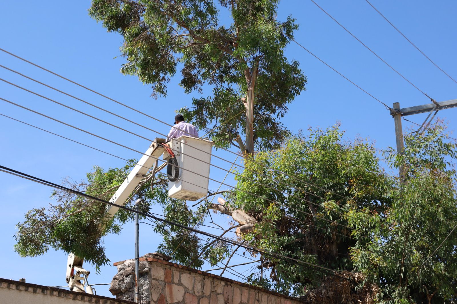 El director Rubén Dávila Aguilar informó que, para llevar a cabo la poda y el retiro del árbol, se contó con el apoyo del personal del Departamento de Parques y Jardines, quienes, utilizando una grúa, iniciaron los trabajos de despunte y posteriormente procedieron al corte del eucalipto. El árbol ya se encontraba inclinado sobre un muro de la privada, además de que el cableado eléctrico pasaba muy cerca, lo que aumentaba el riesgo.