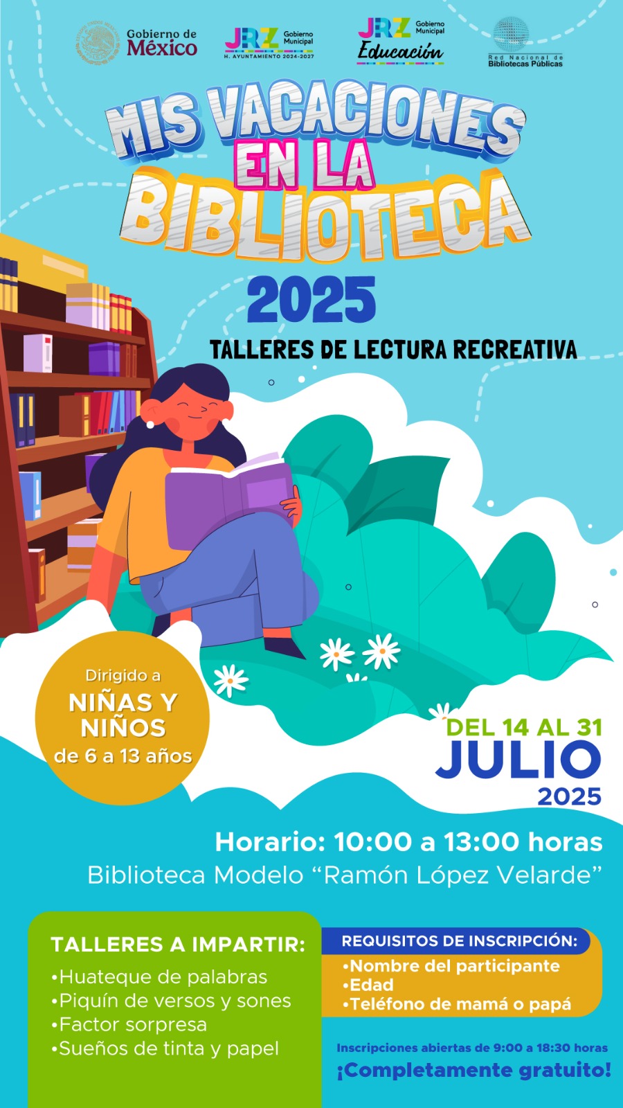Las actividades se desarrollarán del 14 al 31 de julio en un horario de 10:00 a 13:00 horas en la Biblioteca Modelo “Ramón López Velarde”, donde se impartirán talleres de lectura recreativa diseñados para estimular la imaginación, el lenguaje y la expresión artística de los participantes.