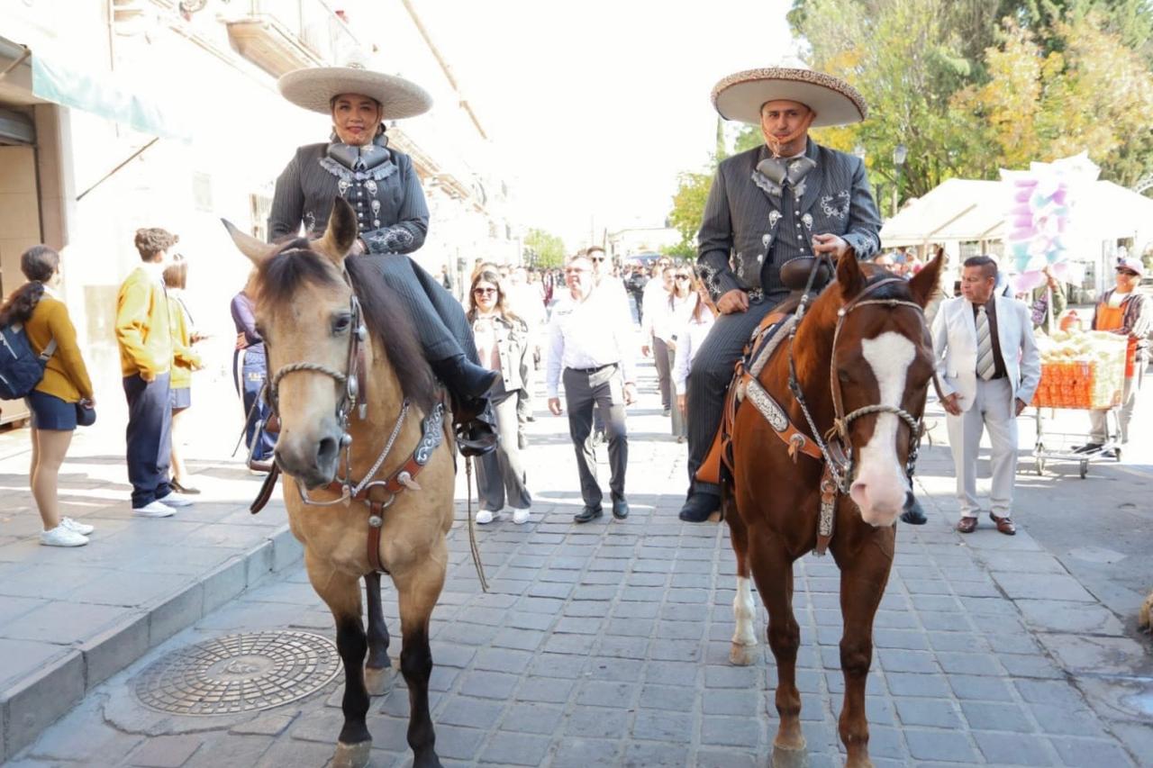 A caballo y portando con orgullo el traje charro, el Presidente Municipal Rodrigo Ureño y su esposa, Estefana Casas, encabezaron el contingente, marcando el inicio del recorrido en la Glorieta y avanzando hasta el puente del Río Grande.