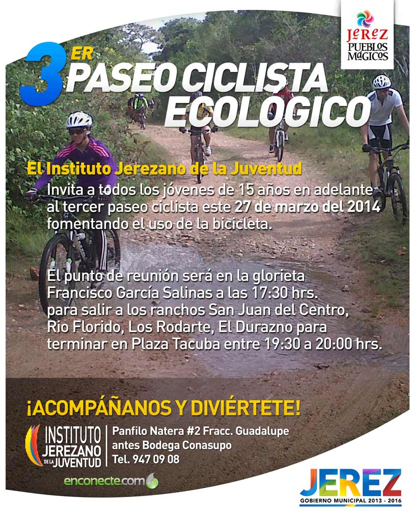 El Instituto Jerezano de la Juventud invita a todos los jóvenes de 15 años en adelante al tercer paseo ciclista este 27 de marzo del 2014 fomentando el uso de la bicicleta.