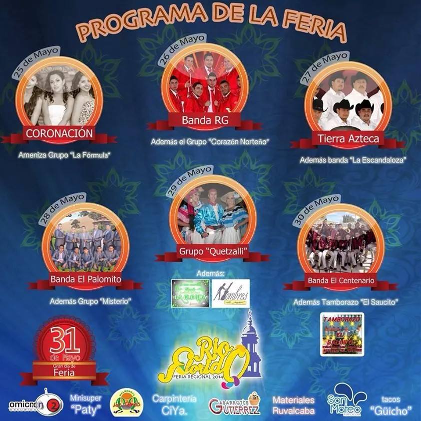 25 de mayo: Coronación con grupo La Fórmula 26 de mayo: Banda RG 27 de mayo: Tierra Azteca 28 de mayo: Banda el Palomino 29 de mayo: Grupo Quetzali 30 de mayo: Banda El Centenario Feria Regional Rio Florido 2014 Navegación de entradas Feria Regional Apozol 2014Feria Jalpa de Méndez 2014