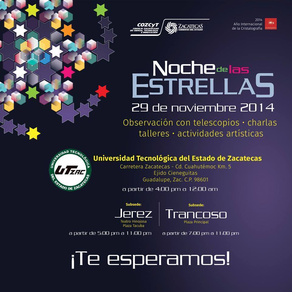 La sexta Noche de las Estrellas en Zacatecas se llevará a cabo el próximo 29 de noviembre de 2014 en las instalaciones de la Universidad Tecnológica del Estado de Zacatecas (UTZAC), desde las 16:00 hasta las 24:00 horas. Ese día se llevarán a cabo conferencias, talleres, obras de teatro, exposiciones, observaciones a simple vista y con telescopios de manera gratuita con el fin de acercar a la población zacatecana a la ciencia a través de la astronomía.